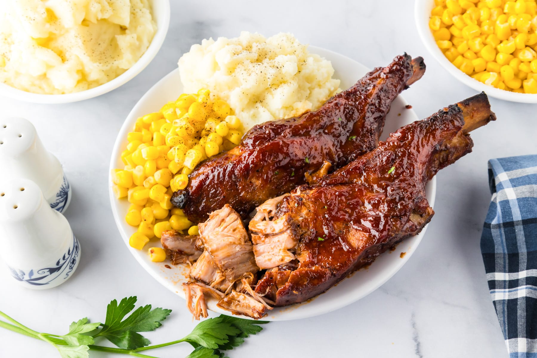 Plate with barbecued slow cooker loin country style pork ribs, mashed potatoes with pepper, and corn; a fork holds a piece of rib meat.Plate with barbecued slow cooker loin country style pork ribs, mashed potatoes with pepper, and corn; a fork holds a piece of rib meat.